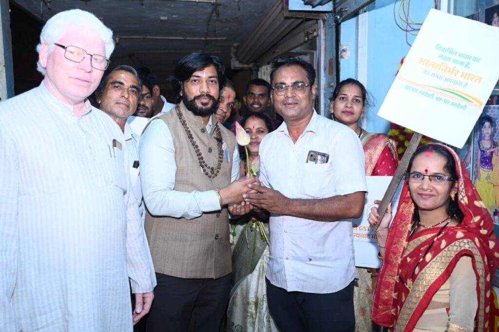N bharat,,,,आरंग/रायपुर — देश के यशस्वी प्रधानमंत्री श्री नरेंद्र मोदी जी ने देशवासियों को NextGen GST (GST 2.0) के रूप में ऐतिहासिक सौगात प्रदान की है। इस निर्णय से देशभर में GST बचत उत्सव का माहौल बना हुआ है। इसी कड़ी में आरंग नगर में आयोजित कार्यक्रम में छत्तीसगढ़ शासन में कैबिनेट मंत्री गुरु खुशवंत साहेब जी ने व्यापारी साथियों और नागरिकों से आत्मीय मुलाकात की। उन्होंने नई दरों के लागू होने पर सभी को कमल का फूल भेंट कर शुभकामनाएं दीं।