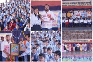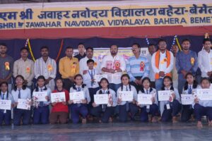 N bharat,,,,बेमेतरा। पीएम श्री जवाहर नवोदय विद्यालय, बहेरा (बेमेतरा) में राजभाषा हिंदी पखवाड़ा का भव्य आयोजन किया गया। कार्यक्रम में बेमेतरा विधायक दीपेश साहू मुख्य अतिथि के रूप में सम्मिलित हुए। इस अवसर पर विद्यालय के छात्र-छात्राओं द्वारा सुलेखन, स्वरचितकविता कविता वाचन ,नारा लेखन, प्रश्नोत्तरी राजभाषा ,पोस्टर निर्माण, लघु कथा ,भाषण ,निबंध ,श्रुतलेख एवं अन्य प्रतियोगिताओं का आयोजन किया गया। विधायक दीपेश साहू ने प्रतियोगिताओं में उत्कृष्ट प्रदर्शन करने वाले विद्यार्थियों को प्रशस्ति पत्र प्रदान कर सम्मानित किया और उनके उज्ज्वल भविष्य की शुभकामनाएँ दीं।