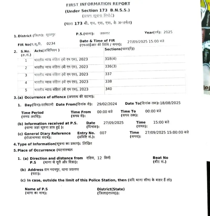 प्रकरण में एसडीएम कोर्ट ने सतर्कता दिखाते हुए तत्काल कार्यवाही की और जयनगर थाने में आरोपी के खिलाफ BNS की धारा 318(4), 336(3), 337, 338 और 340 के तहत एफआईआर दर्ज कराई। हालांकि, आरोपी की गिरफ्तारी की पुष्टि अभी तक नहीं हुई है।
