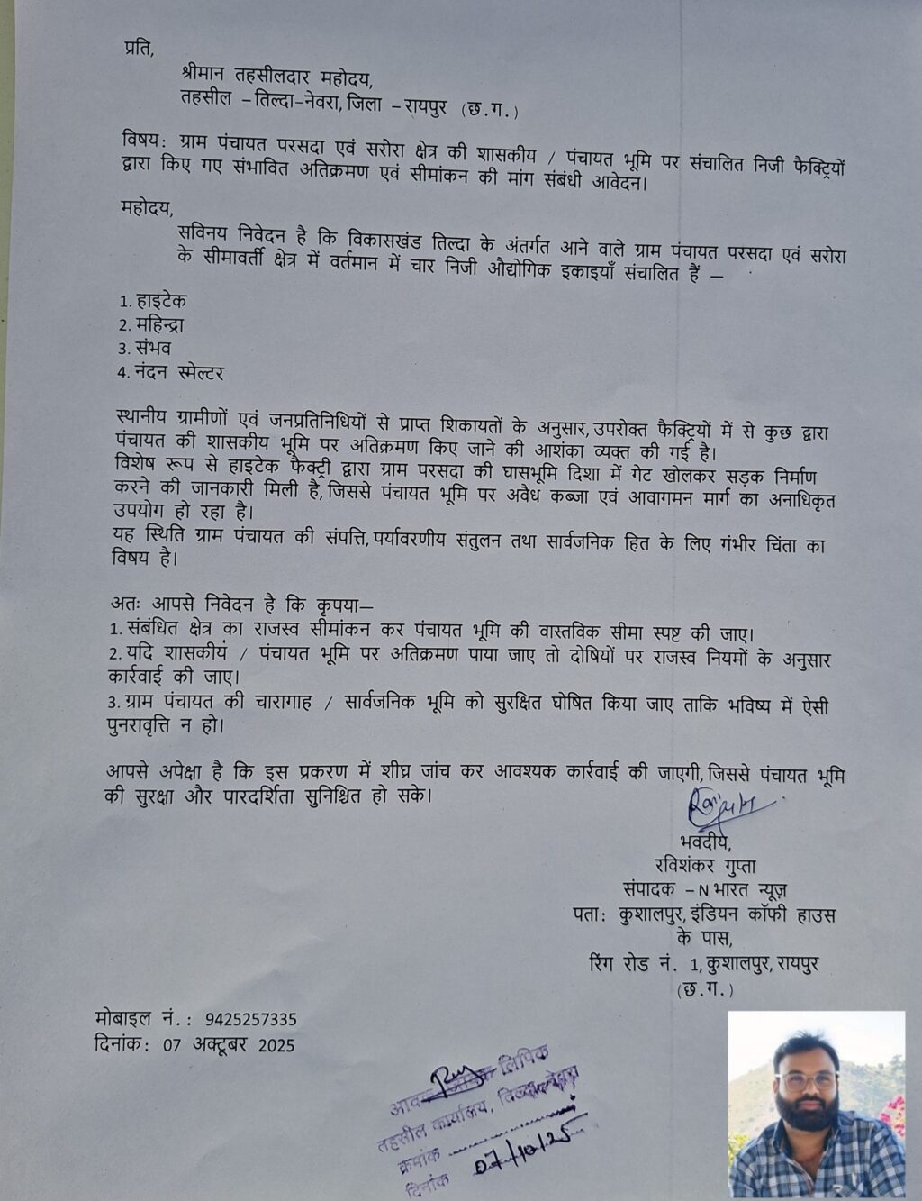 तिल्दा-नेवरा विकासखंड के अंतर्गत ग्राम पंचायत परसदा एवं सरोरा क्षेत्र में संचालित निजी औद्योगिक इकाइयों द्वारा पंचायत एवं शासकीय भूमि के अतिक्रमण का गंभीर मामला सामने आया है। इस संबंध में N भारत न्यूज़ के संपादक रविशंकर गुप्ता ने तहसीलदार तिल्दा-नेवरा को एक लिखित आवेदन देकर जांच एवं सीमांकन की मांग की है।