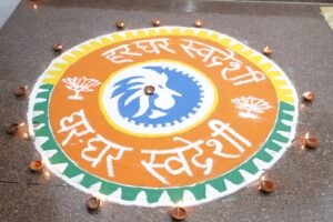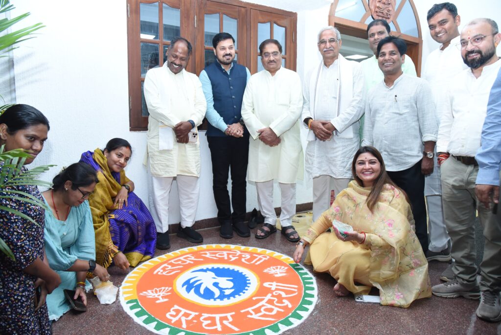 N bharat,,,,रायपुर। में भारतीय जनता पार्टी प्रदेश कार्यालय कुशाभाऊ ठाकरे परिसर में दीवाली व धनतेरस के पावन पर्व पर आज “हर घर स्वदेशी, घर-घर स्वदेशी” की थीम पर रंगोली बना कर स्वदेशी का संदेश दिया। रंगोली बनाने में महिला व बाल विकास मंत्री श्रीमती लक्ष्मी राजवाड़े एवं पंडरिया विधायक भावना बोहरा ने भी मदद की।
