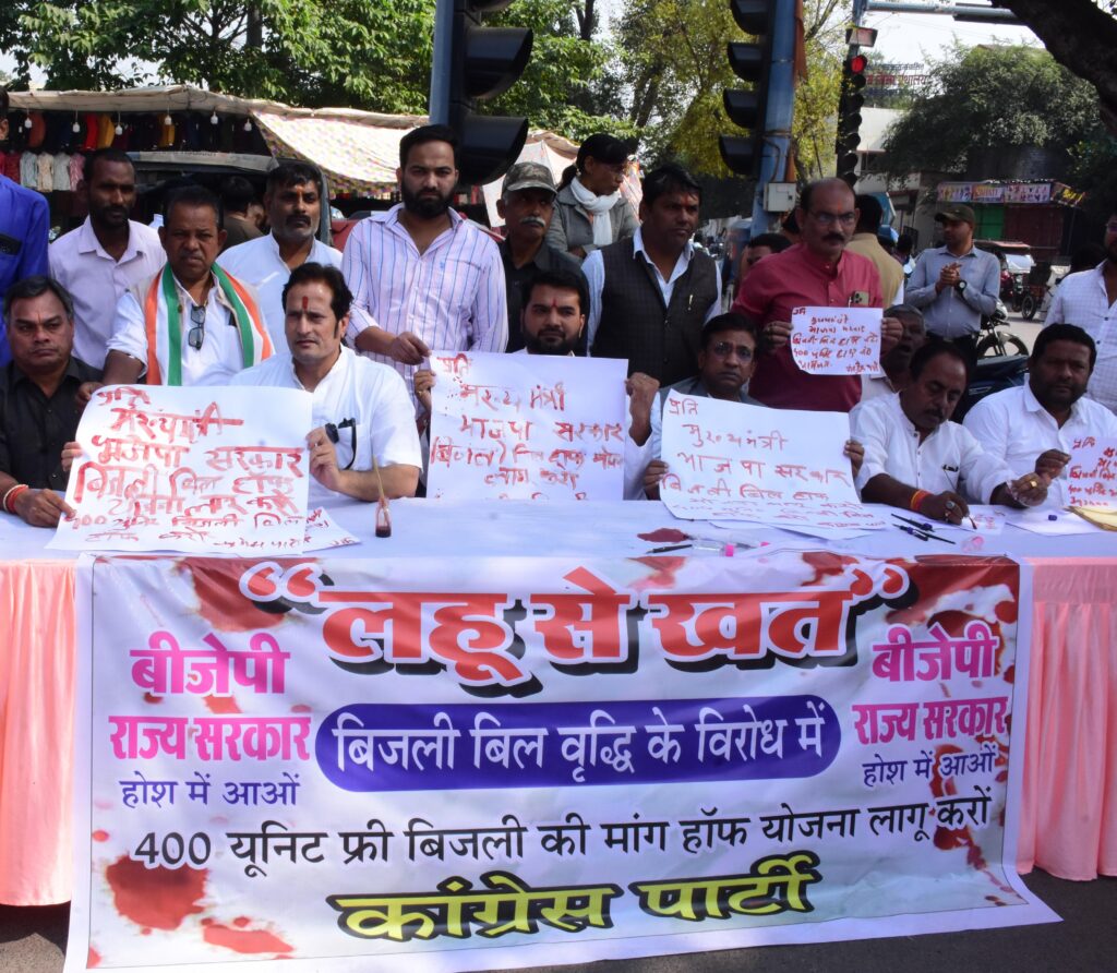 N bharat,,,रायपुर….. पूर्व विधायक विकास उपाध्याय ने बताया कि छत्तीसगढ़ सरकार द्वारा बिजली बिल के माध्यम से छत्तीसगढ़ की जनता का लहू पी रही है जिसके विरोध में आम जन एवं कांग्रेस पार्टी द्वारा भाजपा सरकार के मुख्यमंत्री विष्णु देव साय जी को लहू से पत्र लिखा गया और बिजली विभाग योजना लागू करने एवं 400 यूनिट बिजली विभाग लागू करने की मांग की गई ।