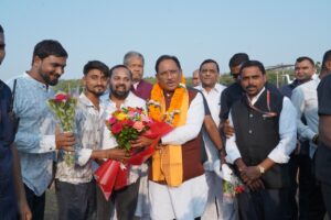 N bharat,,,बेमेतरा, :- छत्तीसगढ़ प्रदेश के मुख्यमंत्री श्री विष्णु देव साय के बेमेतरा आगमन पर स्थानीय हेलीपैड में बेमेतरा विधायक श्री दीपेश साहू ने आत्मीयता व गरिमा के साथ उनका स्वागत एवं अभिनंदन किया। मुख्यमंत्री के साथ उपमुख्यमंत्री अरुण साव कैबिनेट मंत्री दयालदास बघेल जी वरिष्ठ जनप्रतिनिधिगण एवं गणमान्य अतिथि भी उपस्थित रहे।