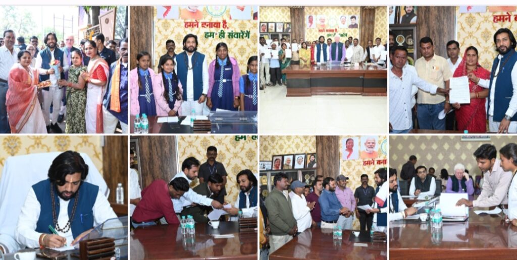 N bharat,,,आरंग/रायपुर । छत्तीसगढ़ सरकार के कैबिनेट मंत्री एवं आरंग विधानसभा क्षेत्र के विधायक गुरु खुशवंत साहेब जी ने सोमवार को आरंग के नेताजी चौक स्थित क्षेत्रीय कार्यालय में जनदर्शन आयोजित किया। मंत्री बनने के बाद पहली बार अपने क्षेत्रीय कार्यालय पहुंचे मंत्री जी का आमजन और जनप्रतिनिधियों ने गर्मजोशी से स्वागत किया। सुबह से ही कार्यालय परिसर में लोगों की भीड़ उमड़ पड़ी थी तथा बड़ी संख्या में नागरिक अपनी समस्याएं लेकर पहुंचे।