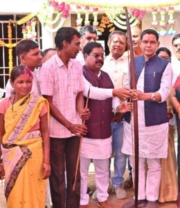 राजस्व मंत्री श्री टंकराम वर्मा ने धमतरी जिले के नगरी विकासखण्ड के ग्राम सांकरा में आयोजित जनजातीय गौरव दिवस के जिला स्तरीय कार्यक्रम में मुख्य अतिथि के रूप में शामिल हुए। इस दौरान उन्होंने कमार बसाहट मसानडबरा पहुंचकर प्रधानमंत्री जनमन योजना के तहत बने आवासों का पूजा-अर्चना कर उद्घाटन किया। उन्होंने पक्के मकान में प्रवेश कर रहे हितग्राहियों को बधाई एवं शुभकामनाएं दी। गांव पहुंचने पर विशेष पिछड़ी जनजाति कमार ने मंत्री श्री वर्मा का स्वागत किया। इस अवसर पर मंत्री ने उपस्थित ग्रामीणों से तीर-धनुष के बारे में विस्तार से जानकारी ली। उन्होंने इस अवसर पर कहा कि शासन विशेष पिछड़ी जनजाति वर्ग के लोगों को मुख्यधारा से जोड़ने के लिए हरसंभव प्रयास कर रहा है। शासन की जनकल्याणकारी योजनाओं का सीधा-सीधा लाभ इन वर्गों को मिले, इसके लिए शिविर इत्यादि आयोजित कर लाभ दिया जा रहा है। प्रधानमंत्री जनमन योजना के तहत पक्का मकान बनने से इनके जीवन स्तर में काफी सुधार होगा। इस अवसर पर बड़ी संख्या में गणमान्य नागरिक और ग्रामीणजन उपस्थित थे।