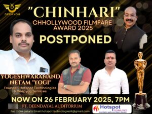 N bharat news,,,,रायपुर।। हमारी संस्था हॉटस्पॉट टेक्नोलॉजी और दीप योग संस्था द्वारा आयोजित की जा रही चिन्हारी फिल्म फेयर 2025 का आयोजन 28 जनवरी को होना था जिसका समय परिवर्तन कर दिया गया है जो अब 28जनवरी की जगह 26 फरवरी दिन बुधवार को किया जाना है जिसका समय भी शाम 7:00 से रात 1100 बजे तक रखा गया है स्थान भी ऑडिटोरियम दीनदयाल ही रहेगा नगरी निकाय और पंचायत चुनाव की वजह से लगे आचार संहिता के कारण हम अपने इस प्रोग्राम को आगे बढ़ा रहे हैं