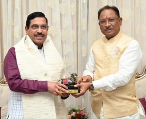 N Bharat News,,,,रायपुर, 12 फरवरी 2025/ मुख्यमंत्री श्री विष्णुदेव साय ने आज शाम नया रायपुर स्थित अपने निवास कार्यालय में केंद्रीय खाद्य मंत्री श्री प्रहलाद जोशी का आत्मीय स्वागत किया। इस अवसर पर मुख्यमंत्री ने उन्हें बस्तर आर्ट का प्रतीक चिन्ह भेंट किया। उल्लखेनीय है कि केंद्रीय मंत्री श्री प्रहलाद जोशी छत्तीसगढ़ प्रवास के तहत रायपुर पहुंचे थे। इस महत्वपूर्ण भेंट के दौरान मुख्यमंत्री श्री साय ने राज्य में किसानों के हित में सरकार द्वारा संचालित योजनाओं और प्रयासों की विस्तार से जानकारी दी।