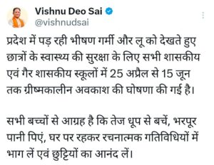 “प्रदेश में पड़ रही भीषण गर्मी और लू को देखते हुए छात्रों के स्वास्थ्य की सुरक्षा के लिए सभी शासकीय एवं गैर शासकीय स्कूलों में 25 अप्रैल से 15 जून तक ग्रीष्मकालीन अवकाश की घोषणा की गई है। सभी बच्चों से आग्रह है कि तेज धूप से बचें, भरपूर पानी पिएं, घर पर रहकर रचनात्मक गतिविधियों में भाग लें एवं छुट्टियों का आनंद लें” – मुख्यमंत्री श्री विष्णु देव साय