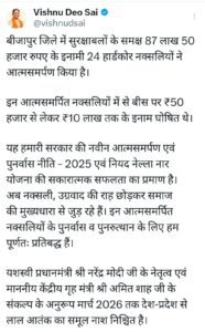 मुख्यमंत्री श्री साय ने कहा कि प्रधानमंत्री श्री नरेंद्र मोदी के नेतृत्व और केंद्रीय गृह मंत्री श्री अमित शाह के मार्गदर्शन में मार्च 2026 तक देश-प्रदेश से लाल आतंक का समूल नाश निश्चित है। यह आत्मसमर्पण उसी निर्णायक यात्रा की एक कड़ी है।