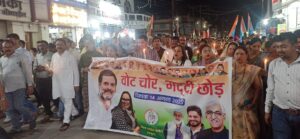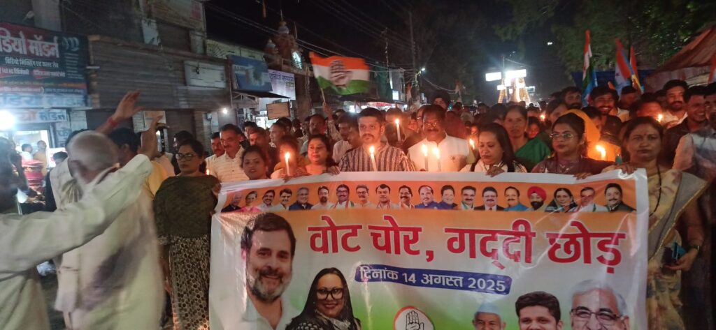 भारतीय जनता पार्टी और चुनाव आयोग पर मतदाता सूची में धांधली और जनता के वोट चुराने के गंभीर आरोप लगाते हुए कांग्रेस पार्टी ने देशभर में चरणबद्ध आंदोलन की घोषणा की है। इसी कड़ी में सरगुजा जिला कांग्रेस कमेटी द्वारा अम्बिकापुर में गुरुवार रात 8 बजे एक भव्य मशाल एवं कैंडल रैली निकाली गई, जिसमें “वोट चोर गद्दी छोड़ो” के नारों से अम्बिकापुर की सड़कों पर जबरदस्त गूंज सुनाई दी।